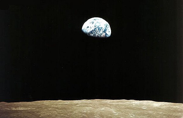 The photograph known as Earthrise was taken by the crew of Apollo 8. It shows the remarkable contrast between blue and white ball which we call home with the stark grey desolation of the Moon.